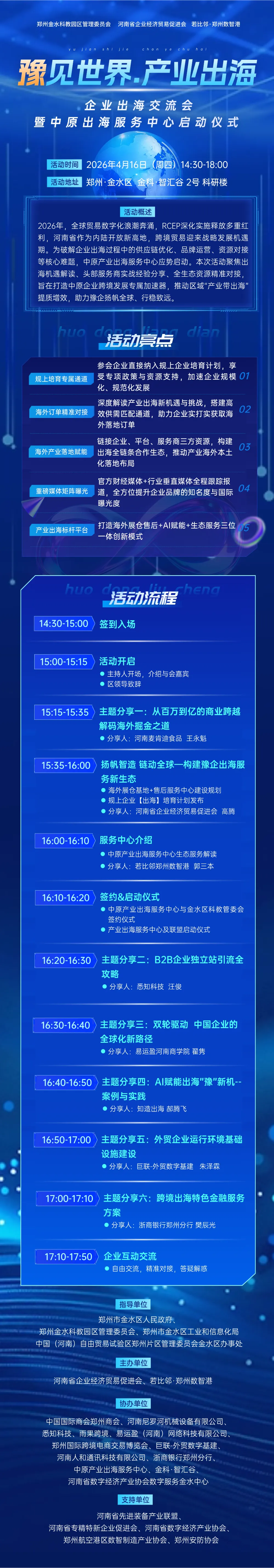 【活动通知】由我会理事单位若比邻·郑州数智港主办、我会数字服务金水中心协办的《企业出海交流会暨中原出海服务中心启动仪式》即将开始
