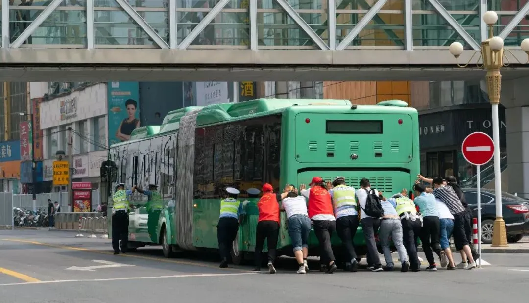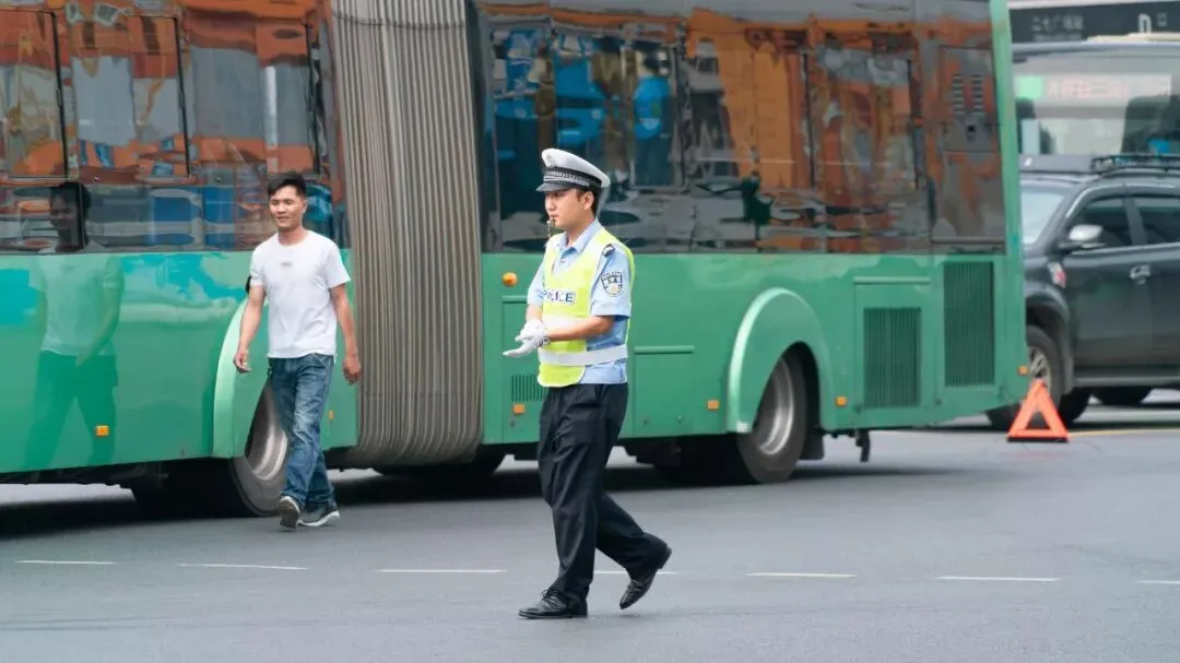 在执勤过程中,突然一辆公交车在路中间抛锚,我们和民警、志愿者们以及热心群众一起,在烈日下把故障公交车推至路边,保障了道路的畅通有序!