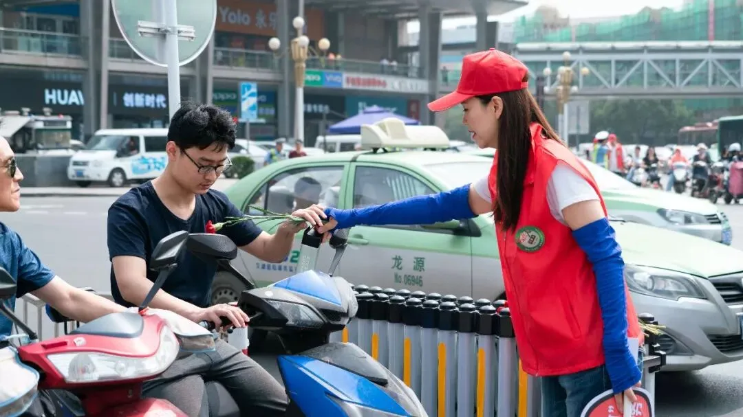 遵守交通法规,不仅收到了鲜花和礼物,还有大家的点赞!他们露出害羞的笑容,同时也让文明出行在更多的人心中开花。