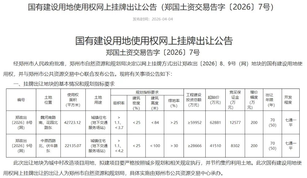 4月4日,郑州市自然资源和规划局正式挂牌两宗备受瞩目的城镇住宅用地——郑政出〔2026〕8号(网)与 郑政出〔2026〕9号(网),合计底价高达10.44亿元。为了避免大家因为信息差而错失机会或踩坑,我们专门搭建了一个【郑州买房交流群】。在这个群里,你能得到:① 市场一线成交变动、政策风吹草动,群内第一时间分享解读;