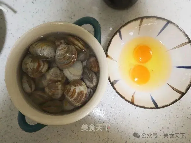 2. 蛤蜊放入清水中,加一勺盐,食用油,混合均匀,浸泡半个小时,鸡蛋磕入碗中。