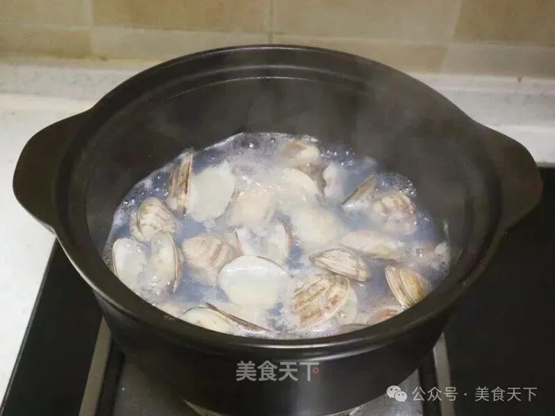 3. 蛤蜊多淘洗几遍,去除沙子,锅中放清水,蛤蜊放进去煮至开口关火。