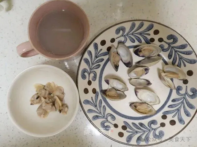 4. 准备适量蛤蜊汤,一部分蛤蜊带壳放入深盘中,剩下只取蛤蜊肉。