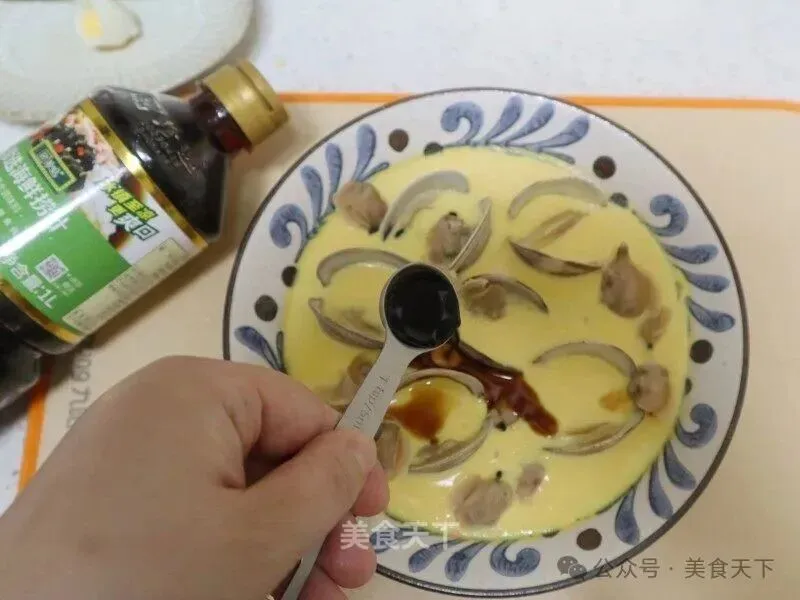 8. 蛤蜊蛋羹加一勺海鲜捞汁,3滴芝麻香油。