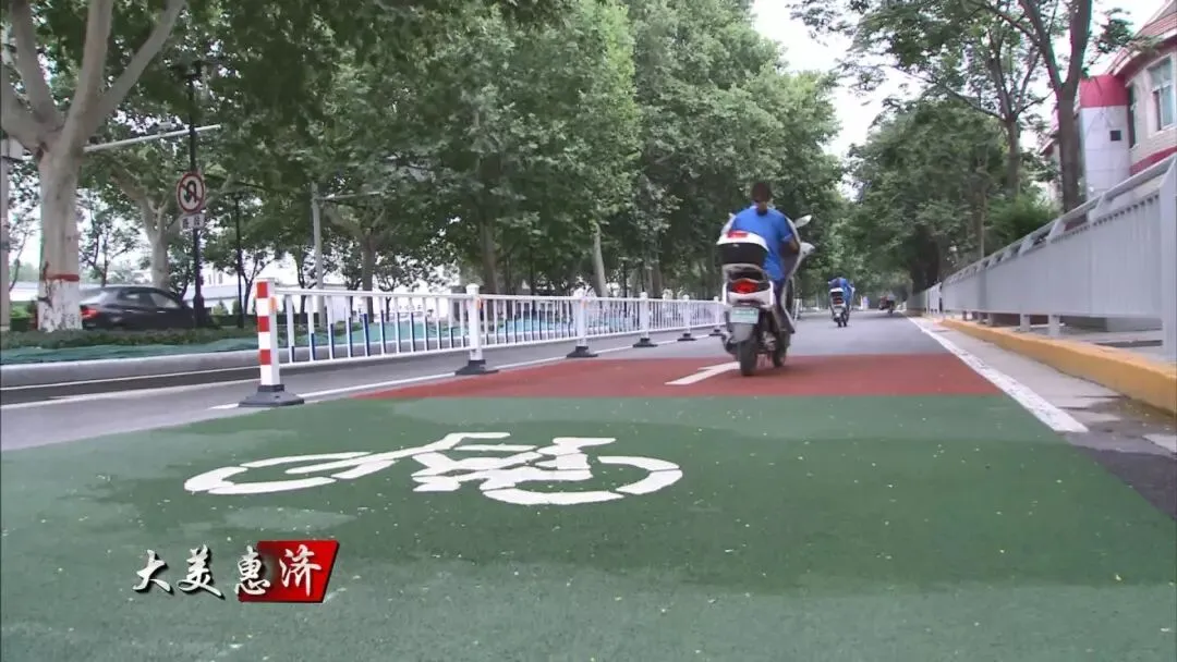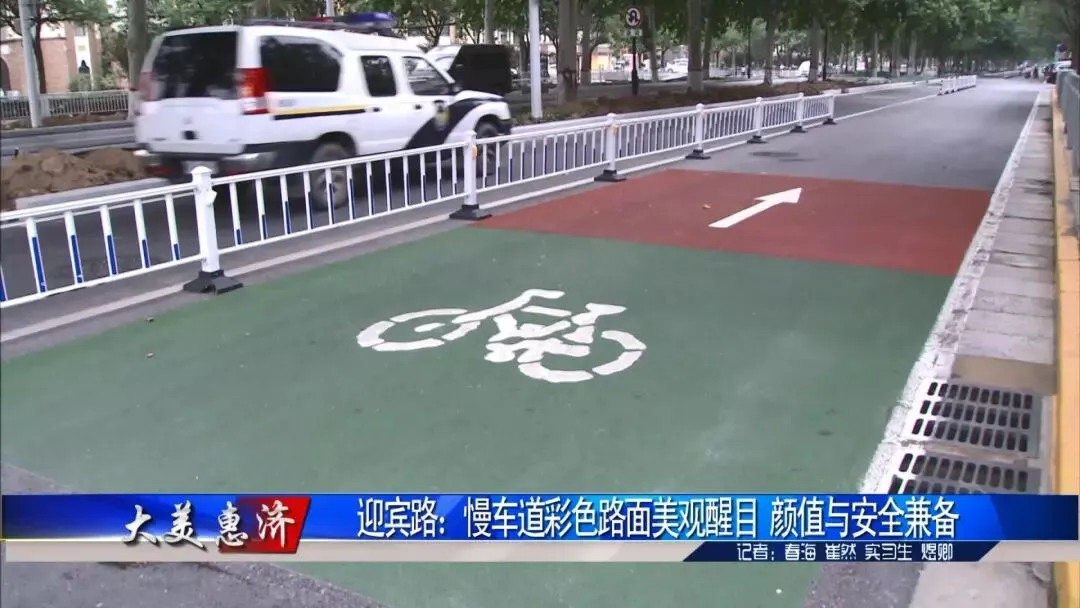 记者在迎宾路看到,两侧慢车道上铺设了红绿相间的彩色路面,上面还喷绘有白色的自行车和导向箭头交通标志,色彩分明,醒目美观,能有效提示非机动车的行驶路线。