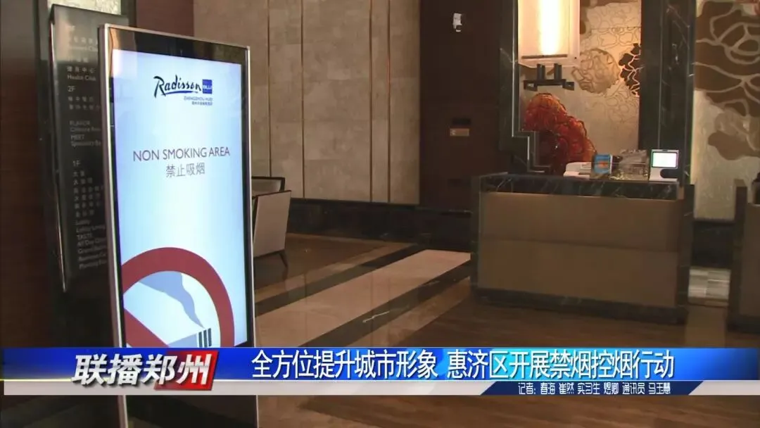 天地丽笙酒店是全国民族运动会的一家接待酒店,在酒店大堂,记者看到电子显示屏正在全面宣传《郑州市文明行为促进条例》、《健康素养66条》和控烟知识。
