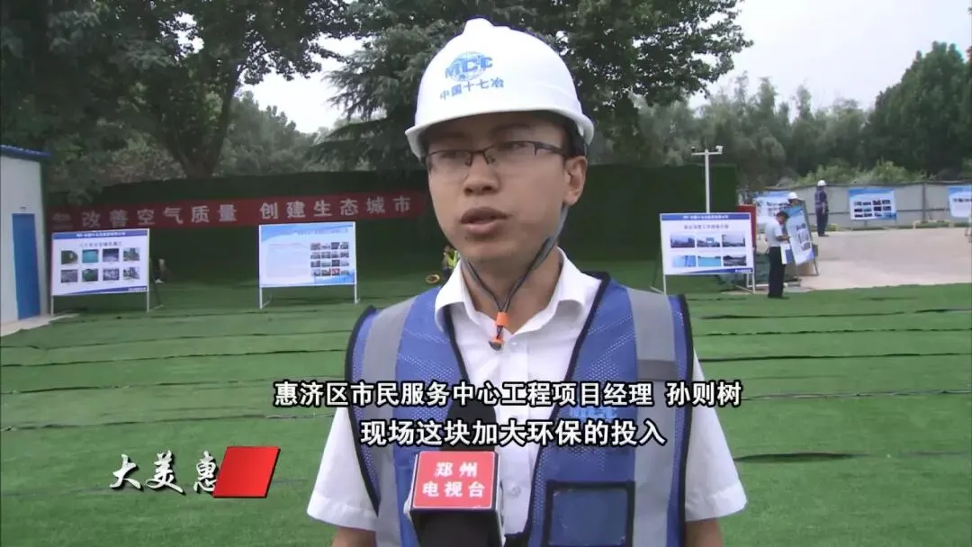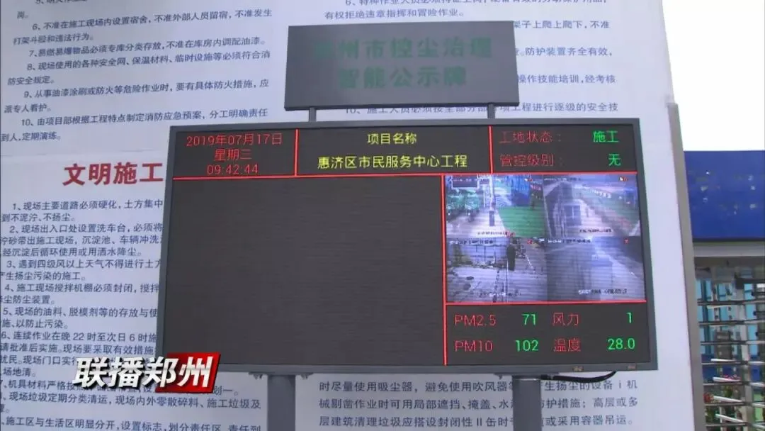 惠济区市民服务中心工程项目,严格按照八个百分百施工要求,现场安装有污染物实时监控屏、封闭式车辆冲洗台。配置大型雾炮机、塔吊喷淋及围挡喷淋系统,极大的降低扬尘污染。