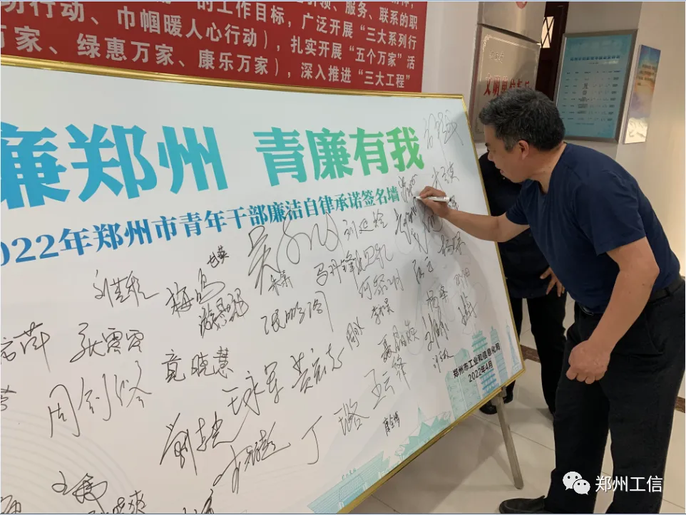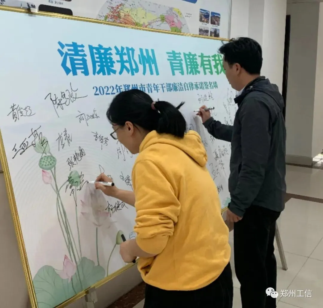 青年干部积极踊跃在“清廉郑州 青廉有我”签名墙上签名,纷纷表示要不断筑牢理想信念,永远跟党走,扣好廉洁从政的第一粒扣子,守牢拒腐防变防线,不断增强“四个意识”、坚定“四个自信”、做到“两个维护”,立足岗位,建功立业!