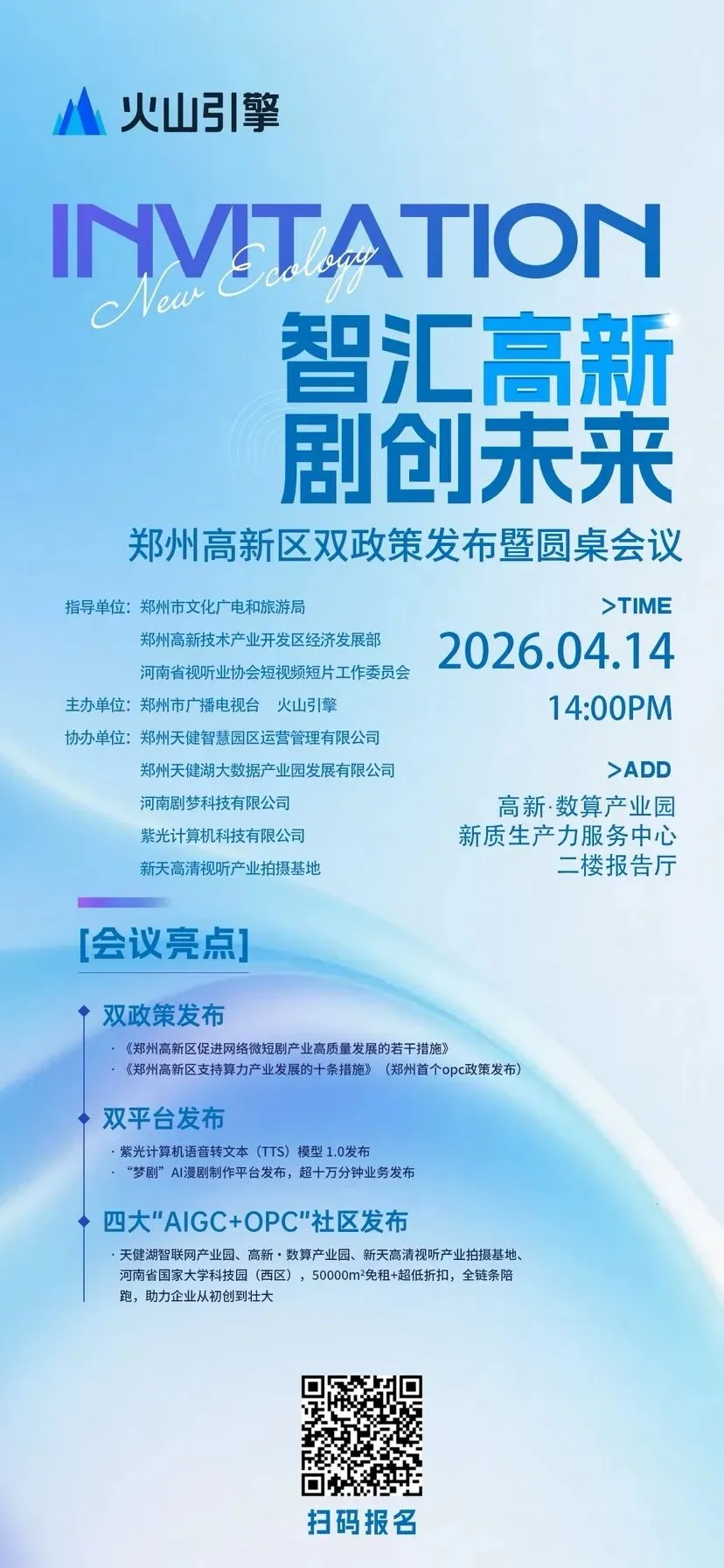 2026年4月14日,“智汇高新 剧创未来—— 郑州高新区双政策发布暨圆桌会议”将在高新·数算产业园新质生产力服务中心二楼报告厅举行。