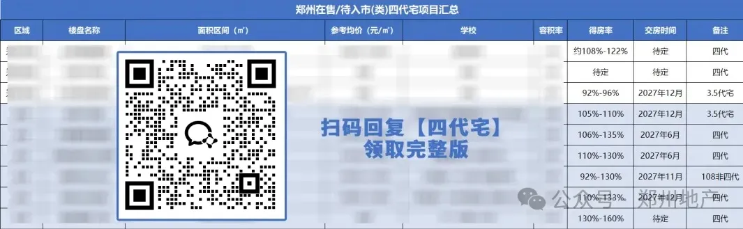 关于郑州四代宅,我们的主编宋词老师专门录制了一条视频,把“四代宅”讲的非常透彻,有助于你快速了解郑州当下的四代宅市场!同时,扫码也可以领取一份《郑州在售及待入市(类)四代宅项目清单》,每个项目的面积段、得房率、容积率、交房时间以及划片学区,标注的明明白白。