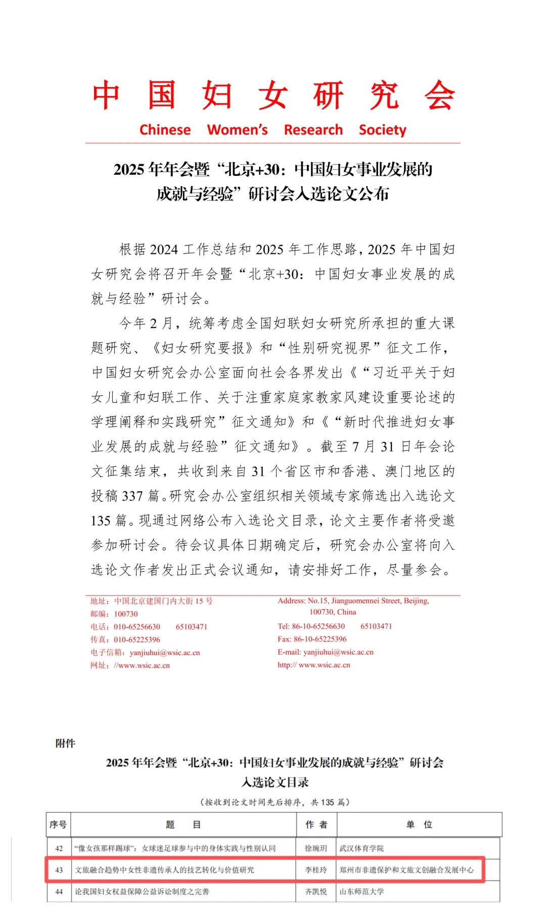 日前,中国妇女研究会2025年年会暨“北京+30:中国妇女事业发展的成就与经验”研讨会在京召开。全国妇联党组书记、副主席、书记处第一书记,中国妇女研究会会长黄晓薇出席开幕式并作主旨报告。560余位专家学者、妇女工作者和国际组织代表等在线上线下参会。郑州市非遗保护和文旅文创融合发展中心主任李桂玲撰写论文《文旅融合趋势中女性非遗传承人的技艺转化与价值研究》从全国337篇稿件中入选,并应邀赴会发言。