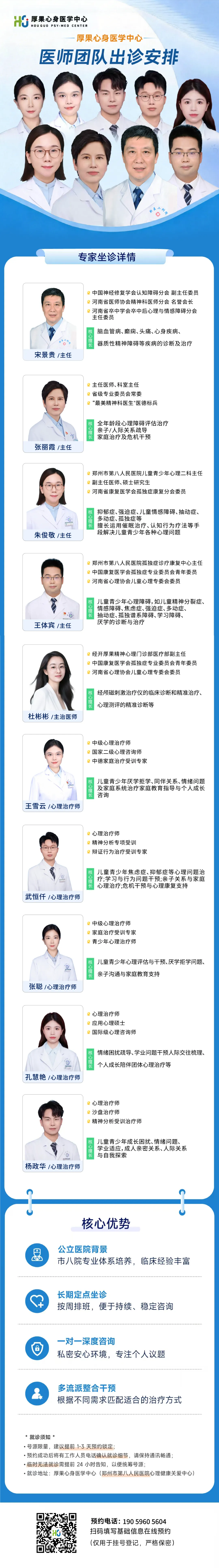 郑州精卫中心、郑州市第八人民医院等多位专家出诊厚果心身医学中心。让您不用来回奔波就能在家门口就医,享受优质的医疗资源。