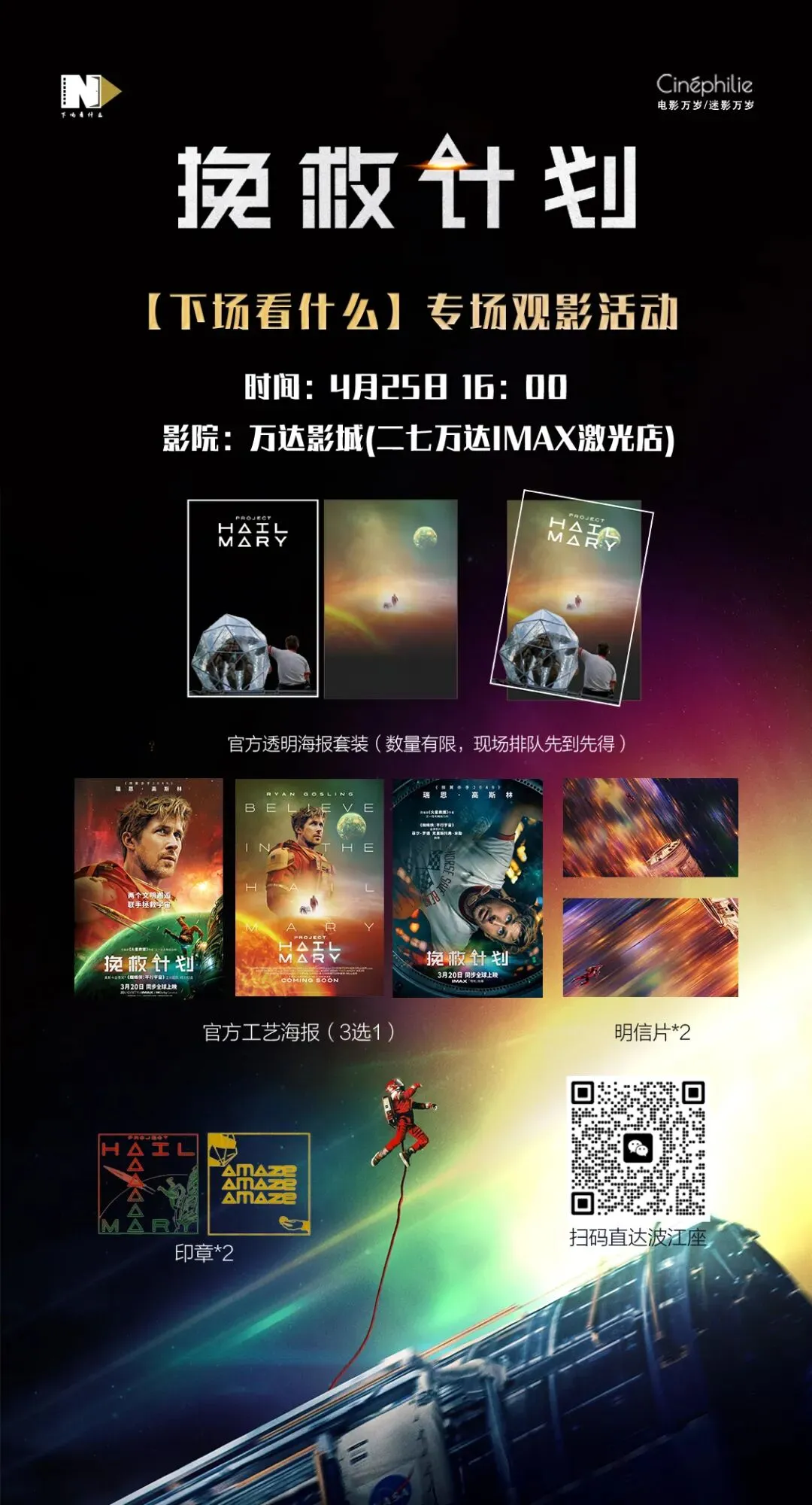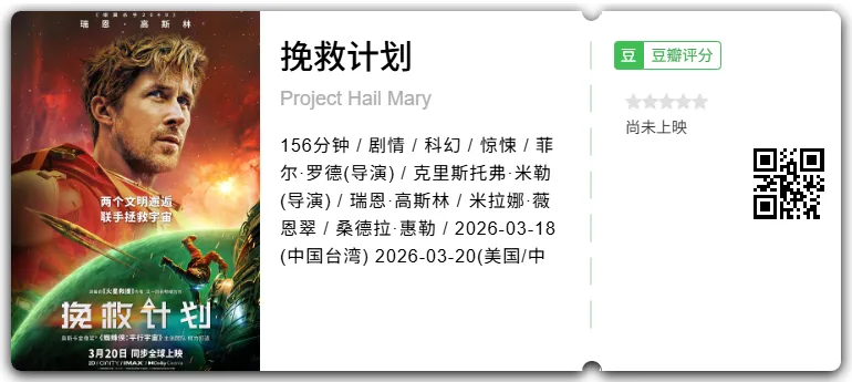 《火星救援》作者安迪·威尔豆瓣9.1分超高口碑原著 × “高司令”瑞恩·高斯林领衔主演 × 奥斯卡黄金班底护航官方透明海报套装(现场排队领取,先到先得)、官方工艺海报、明信片×2、印章×2主演: 瑞恩·高斯林 / 米拉娜·薇恩翠 / 桑德拉·惠勒 / 梁振邦 / 利兹·金斯曼 / 更多...上映日期: 2026-03-20(美国/中国大陆) / 2026-03-18(中国台湾)影片改编自《火星救援》作者安迪·威尔豆瓣9.1分神作,瑞恩·高斯林领衔主演,奥斯卡金牌主创团队倾力打造。影片海外首映后收获媒体与首批观众的一致盛赞,烂番茄新鲜度超越《火星救援》直飙96%,权威媒体网站MTC评分80,被誉为“重新定义一个时代的科幻电影!”其中既有宇宙的宏大,又藏着人性的光芒,科学谜题与温暖羁绊交织,令人欲罢不能。海外权威媒体盛赞“一部绝对的太空科幻神作,注定成为类型片经典。”“IMAX银幕上的太空壮丽景象令人叹为观止!”国内首批观众也被深深打动,“全方位超越《火星救援》!”“格雷斯和洛基就是2026年度最佳搭档!”瑞恩·高斯林的演技同样收获无数点赞,“他精准拿捏了角色的平凡与勇敢,绝对是人生角色!”更有观众表示“影片最动人的地方,在于跳出了传统科幻片套路,从全人类命运共同体上升到了星际命运共同体!”影片跳出了传统科幻片文明对抗、末世焦虑的套路,以温暖治愈的底色,重新定义科幻表达。被迫上天的地球人格雷斯,与同伴全灭的外星工程师洛基,在浩瀚宇宙中,两个背负着母星存亡使命的孤独灵魂,不靠武力对抗,而是以科学与真诚守护了两个文明,完成了宇宙级双向救赎,也让观众在硬核的科学设定之外,感受到了最纯粹的情感力量,不少观众直言“笑着笑着就哭了,哭完之后心里满是温暖,这才是科幻故事最动人的样子”。片中的科学设定与数学公式,均由原著作者安迪·威尔亲自撰写,主创团队让硬核的天体物理、星际航行知识,通过可视化的镜头语言变得通俗易懂。而洛基所在的外星飞船,则跳出了固有的科幻套路,以独特的设计语言“手搓”出兼具想象力与可信度的外星文明场景,让两个文明的相遇、两个孤独灵魂的靠近,有了最真实可感的载体。这份极致的工程师精神,让观众能沉浸式踏入这场跨越光年的星际冒险,真切相信“不可能的宇宙奇迹皆可能发生”。同时影片打破了传统科幻片宏大管弦乐的配置,选用了披头士经典曲目《Two of Us》等多首跨越时代的金曲。其中桑德拉·惠勒翻唱的《Sign of the Times》,更是将角色的内心世界与人类文明的命运走向完美融合,成为经典名场面。瑞恩·高斯林贡献了极具层次感的封神表演,他精准拿捏了格雷斯这个“非英雄主角”的特质,让普通人的勇气表达极具说服力。桑德拉·惠勒则成功塑造了伊娃·斯特拉特这个极具弧光的女性领袖,在理性决断与温柔底色间完美平衡。被观众称为“科幻片里最复杂也最动人的女性角色”。而另一位重磅主角“洛基”,则凭借又萌又E的可爱性格,获得了所有观众的“宠爱”。
