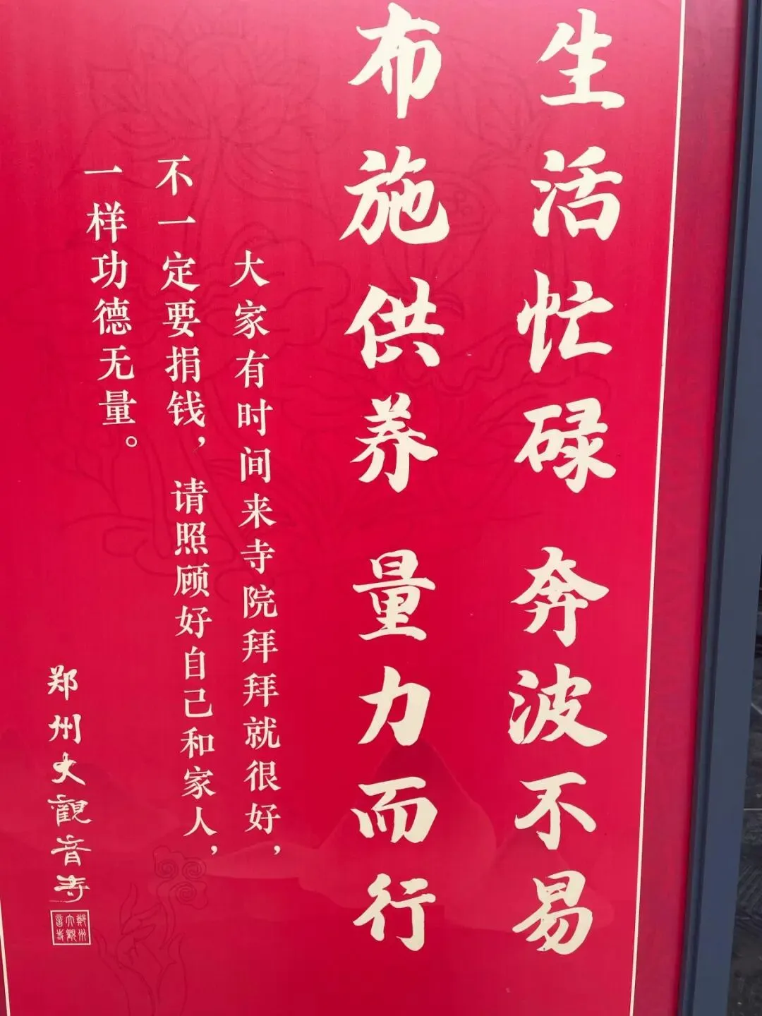 生活忙碌,奔波不易,布施供养,量力而行。大家有时间来寺院拜拜就很好,不一定要捐钱,请照顾好自己和家人,一样功德无量!