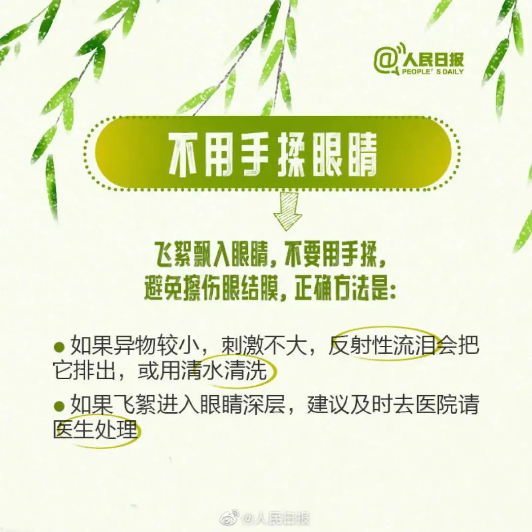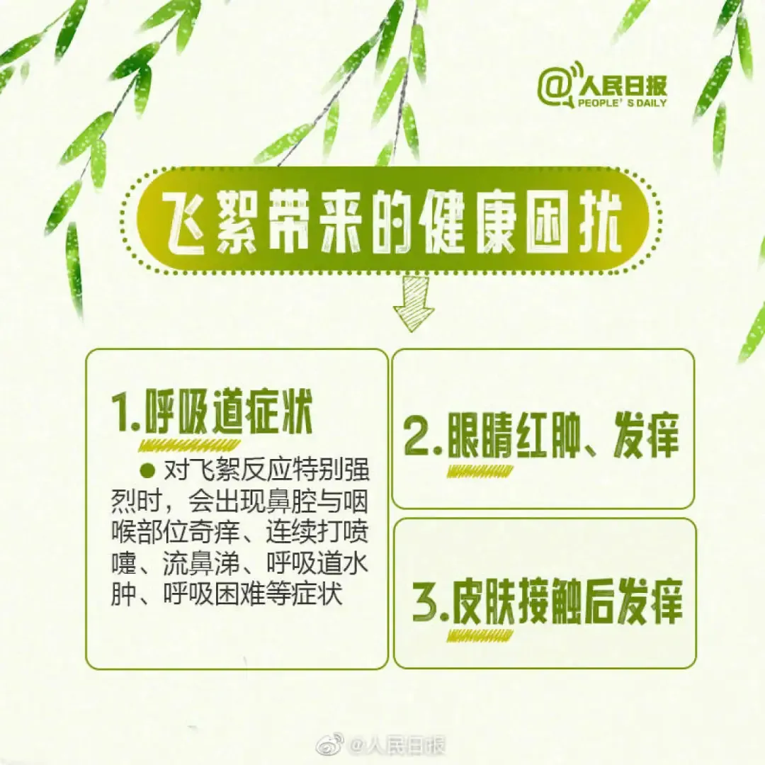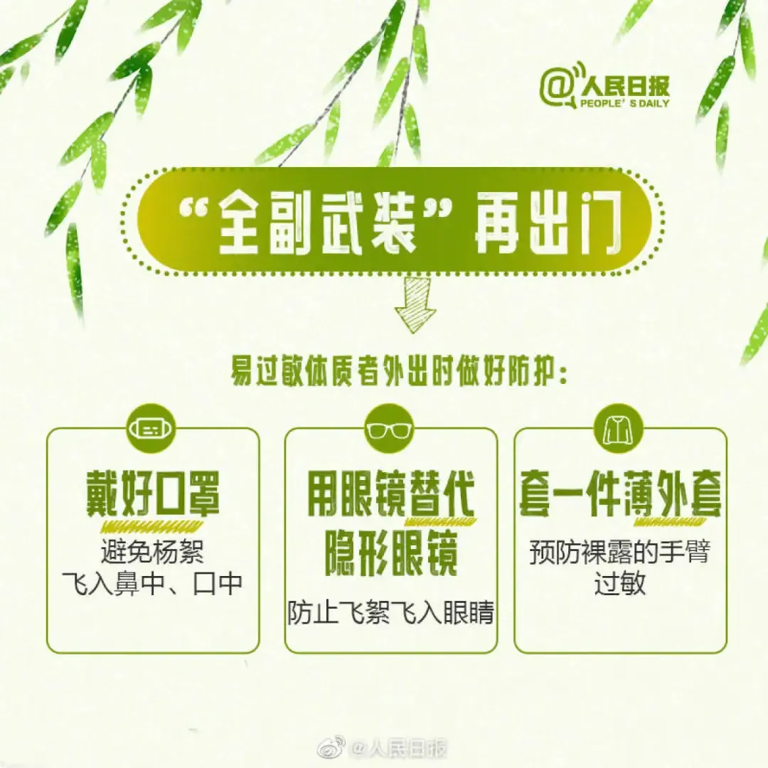 此外,在晴好天气下,每天的10时至16时是杨柳飞絮的高发时段,户外活动可以尽量避免此时段,选择在早晨、晚上或者雨后。