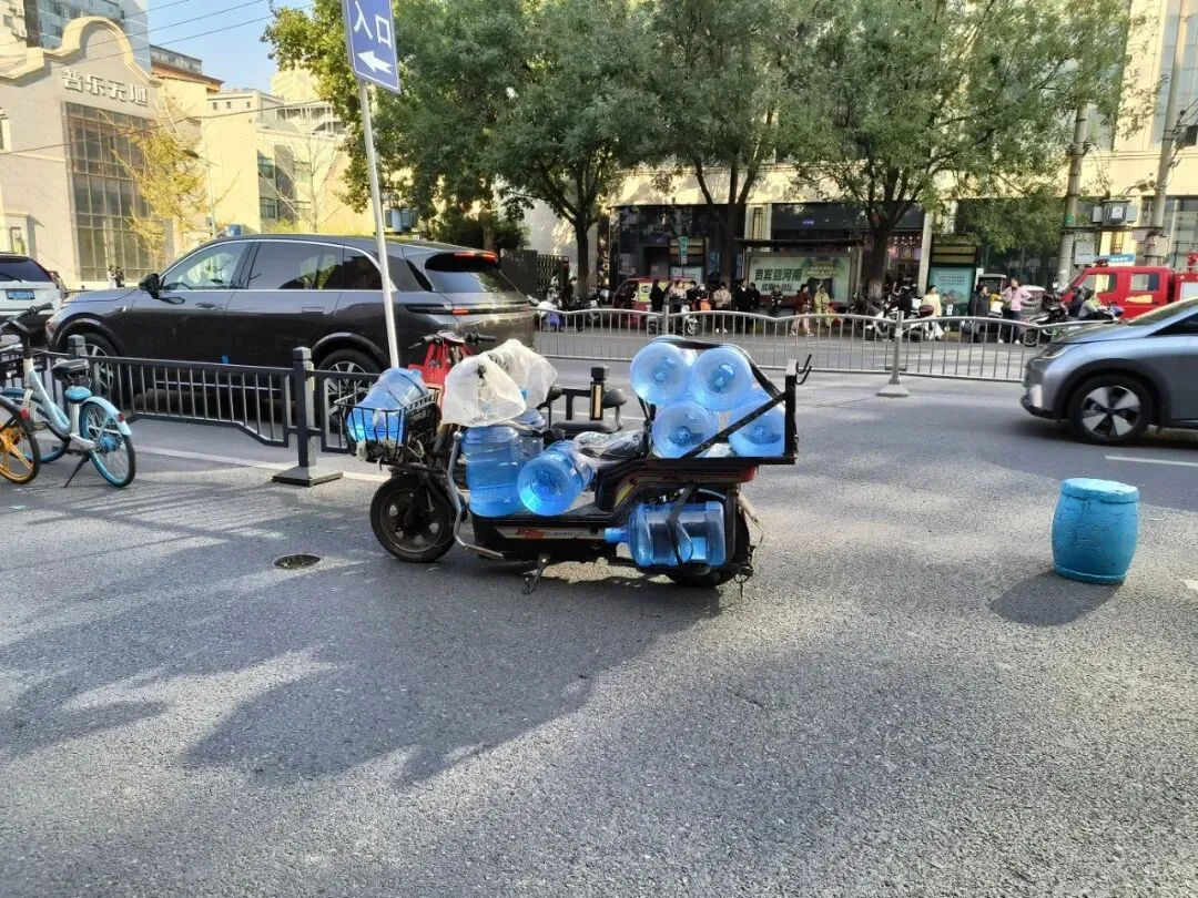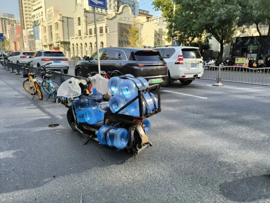 在郑州的街道上,看见一个送水工的车。