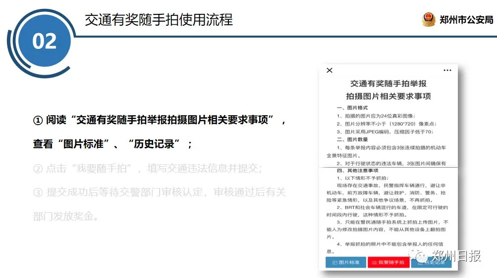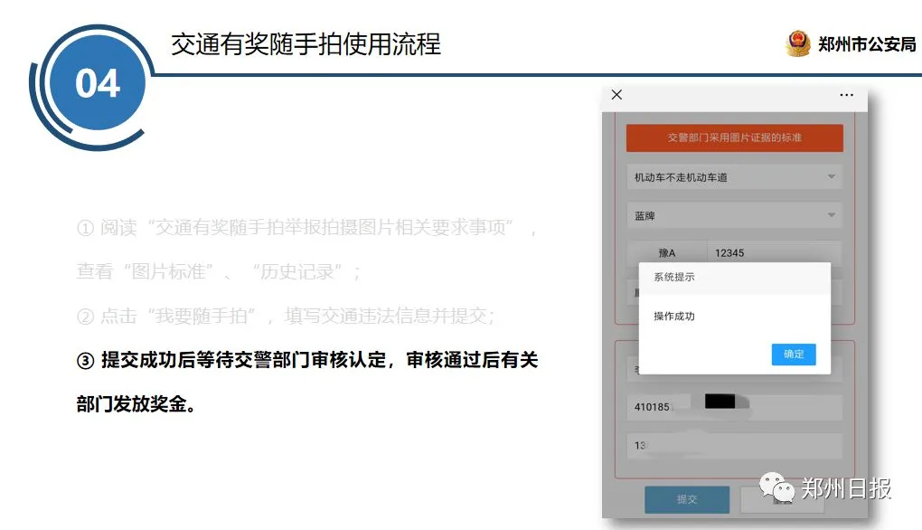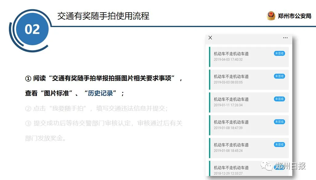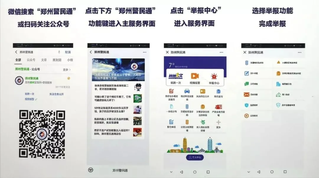 通过关注“郑州警民通”微信公众号,进入主界面“举报中心”板块,填写相关举报信息后即举报成功。之后,举报人可随时通过“举报记录”查询相关进度。