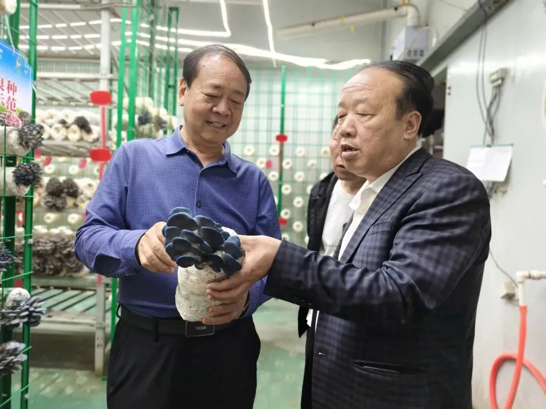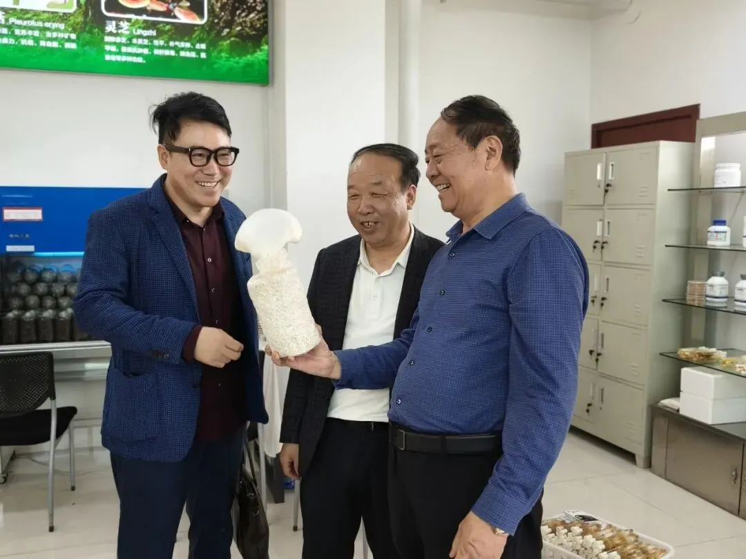 李彦增(右)向张金岭(中)介绍公司培育的白灵菇新品种 4月12日,郑州市二七区樱桃沟村党支部书记张金岭一行到许昌世纪香食用菌产业园取经问策,参观考察乡村食用菌产业高质量发展情况。河南世纪香食用菌开发有限公司董事长李彦增研究员对张金岭一行到来表示欢迎,介绍了公司联农带农富农情况并引领参观考察。