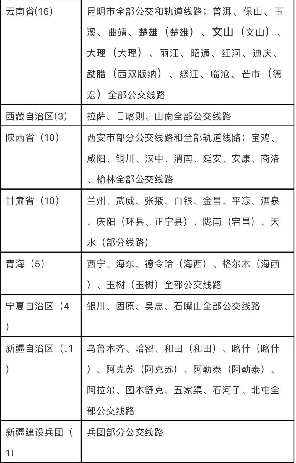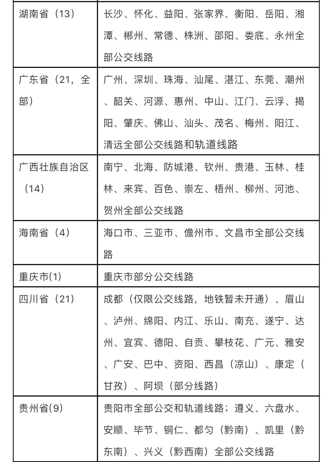 需要注意的是,若无明确说明,上述图表中所列交通一卡通应用范围均为市区的公交或城市轨道交通线路。