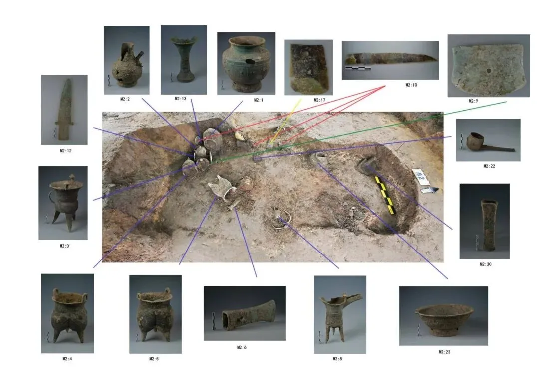 M2出土长达75厘米的玉戈,是郑州商城目前发现的最大玉戈。M2出土青铜器组合填补了学术界对中商青铜器文化研究的空白。M2底部六处殉狗坑分别位于头部、腰部及四肢处,这一罕见的殉葬文化现象为晚商高等级贵族墓葬殉狗文化的来源提供了直接的证据。