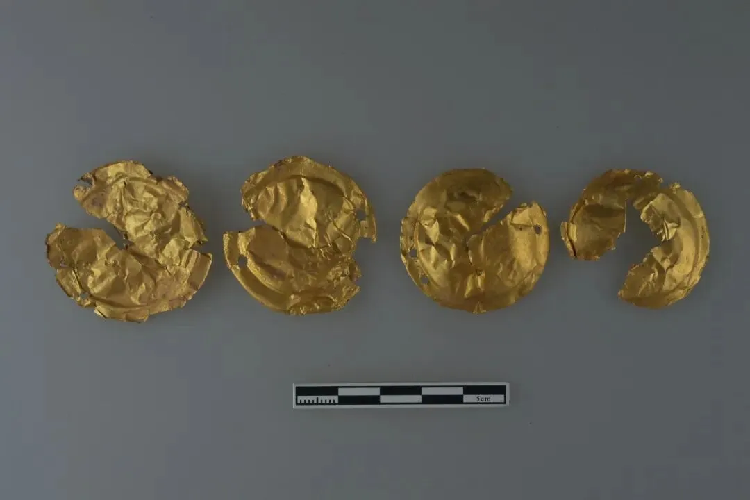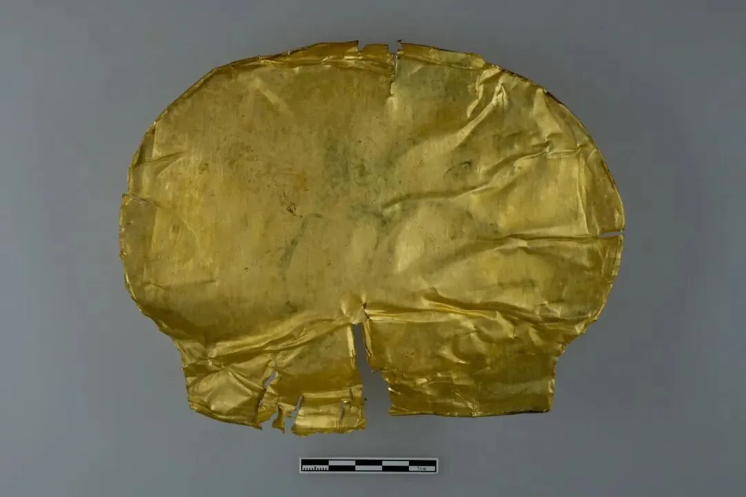 △M2出土的金覆面、金泡和以金箔为地镶嵌绿松石的兽形牌饰