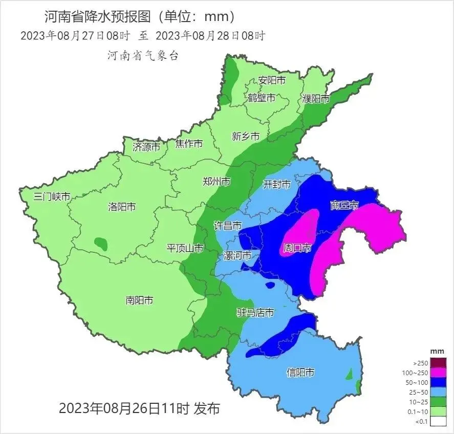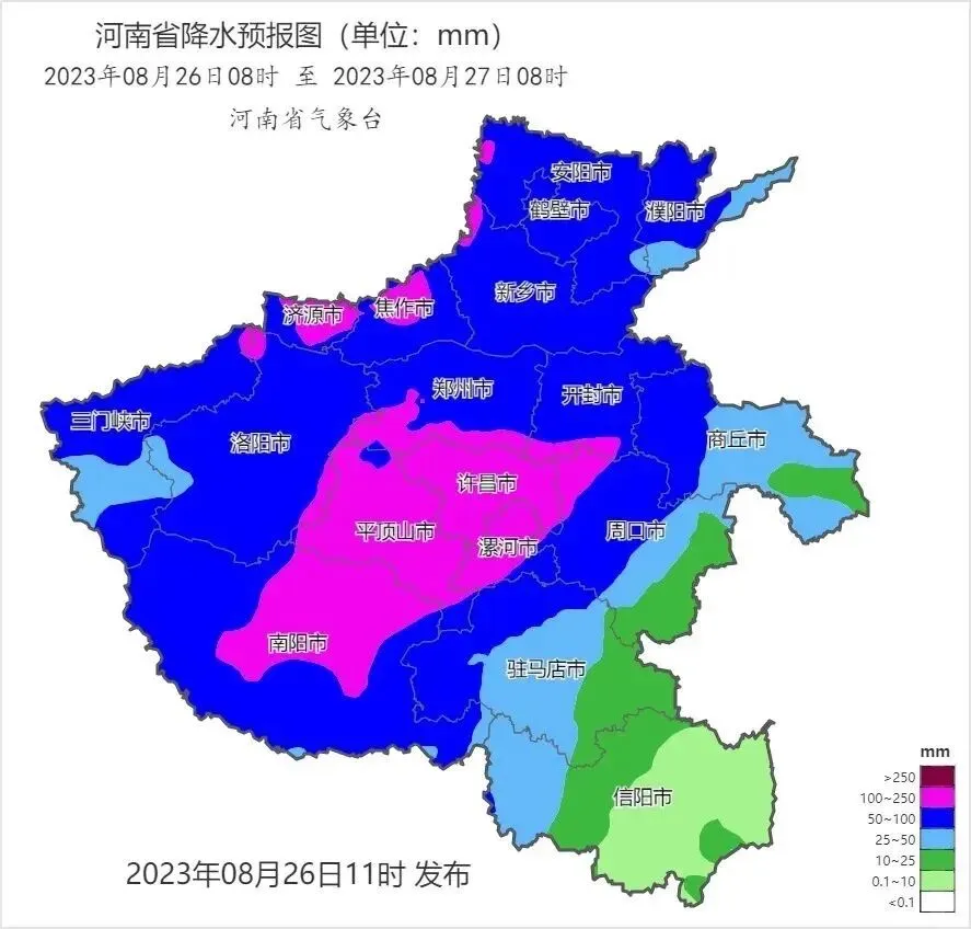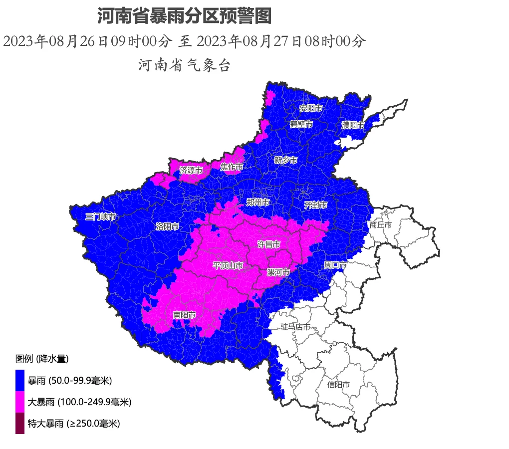 河南省气象台8月26日9时发布暴雨黄色预警:预计8月26日09时至27日08时,黄河以北和郑州、开封、三门峡、洛阳、平顶山、许昌、漯河、南阳、信阳西部、驻马店西部、周口西部、商丘西部将出现暴雨,其中安阳西部、新乡西部、焦作、济源、郑州西南部、开封南部、三门峡北部、洛阳东部、平顶山、许昌、漯河、南阳北中部、周口西部部分县市将出现大暴雨,南阳北部、平顶山个别点可达特大暴雨,强降雨时伴有雷电、短时强降水(最大小时降水量40到70毫米)、短时大风(8到10级)等强对流天气。请密切关注属地气象部门发布的最新预报信息和气象灾害预警信号,做好防范应对工作。上述地区的相邻县市(区)也需关注。