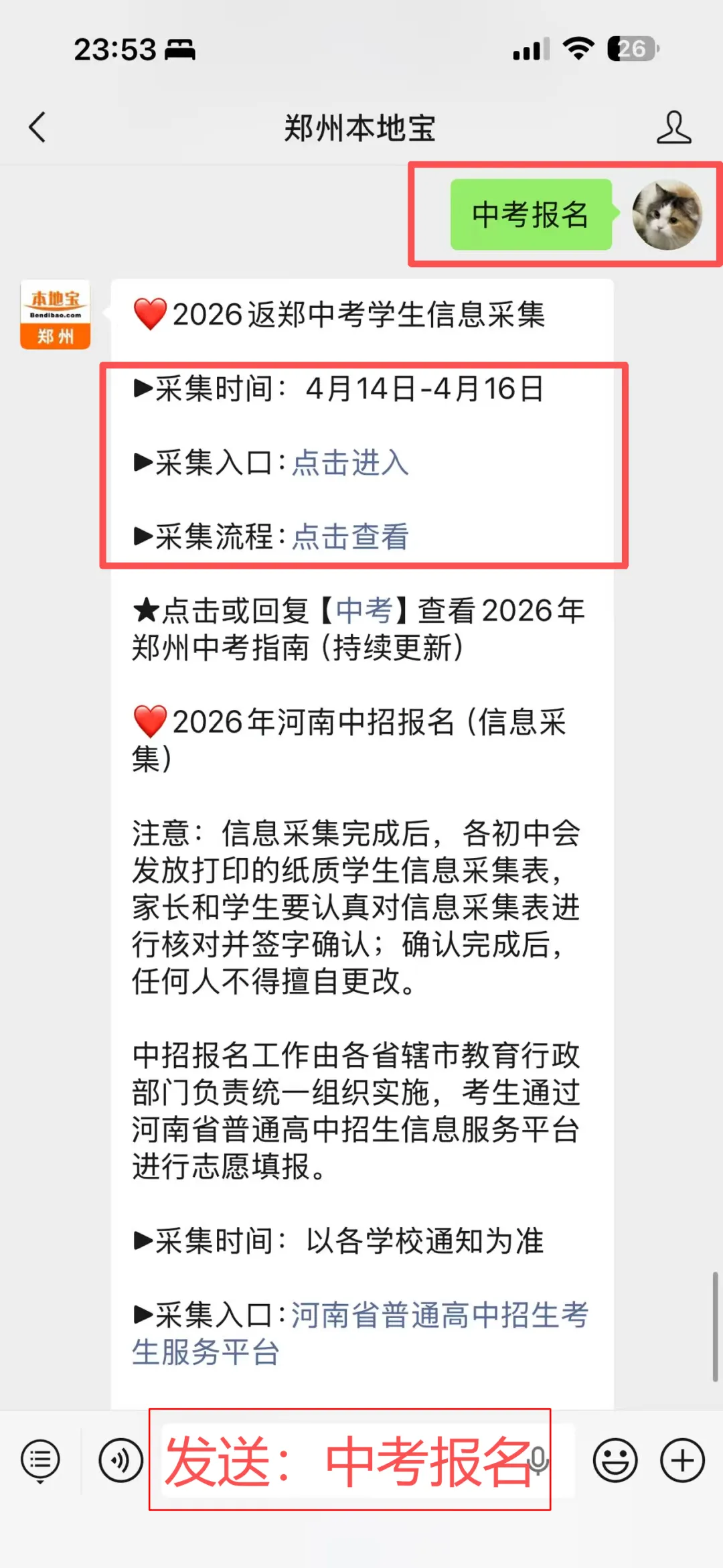 在后台聊天框发送【中考报名】
