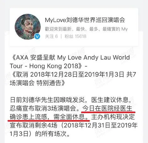 之后,主办方公告,刘德华确诊患上流感,需要彻底休息养病,后续的四场演唱会也被取消。