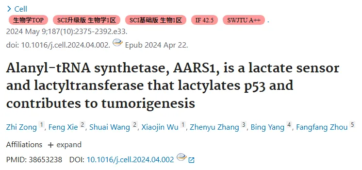 文章标题:丙氨酰-tRNA合成酶AARS1是乳酸传感器和乳酸转移酶,通过乳酸化p53促进肿瘤发生