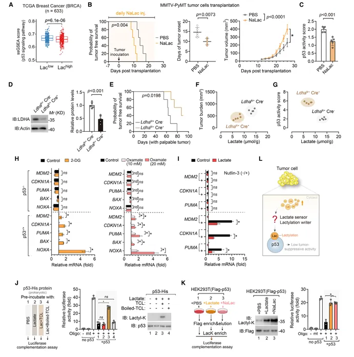 TCGA乳腺癌数据分析显示,高乳酸信号与p53信号通路评分显著负相关。在MMTV-PyMT乳腺癌小鼠模型中,腹腔注射乳酸钠加速肿瘤发生并抑制p53活性。LDHA条件性敲除延迟肿瘤形成、降低肿瘤乳酸含量并增加p53活性(图1)。