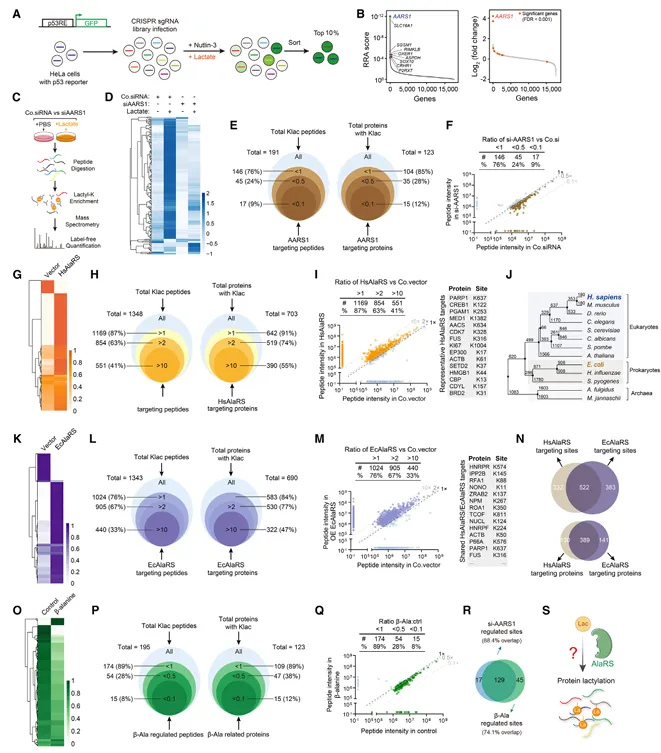 蛋白质组学分析显示,AARS1敲低使约80%的乳酸化肽段强度下降,而AARS1过表达使90%的乳酸化肽段强度升高。大肠杆菌EcAlaRS同样具有催化真核细胞乳酸化的能力,且与AARS1的靶点高度重叠。β-丙氨酸可有效抑制全局乳酸化。