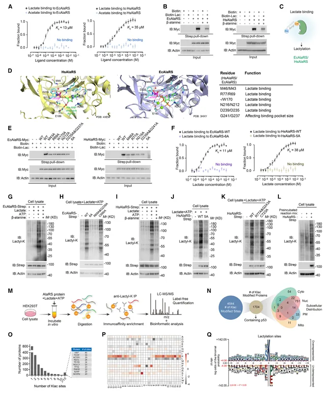蛋白质组学显示AARS1是p53的结合蛋白,Co-IP证实两者直接相互作用,Kd约为39 μM和21 μM。在细胞和体外,AARS1-WT而非乳酸或ATP结合突变体可催化p53的K120和K139位点乳酸化,并被β-丙氨酸抑制(图4)。