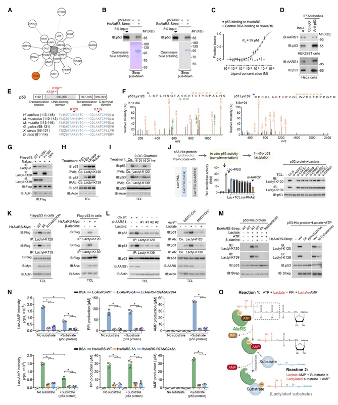 本研究首次揭示丙氨酰-tRNA合成酶AARS1是细胞内乳酸传感器和乳酸转移酶,通过ATP依赖的乳酸-AMP中间体催化全局赖氨酸乳酸化,并特异性乳酸化p53的K120和K139位点。乳酸化通过中和赖氨酸正电荷,破坏p53 DNA结合域与响应元件的结合,抑制p53的液-液相分离、转录活性和肿瘤抑制功能。