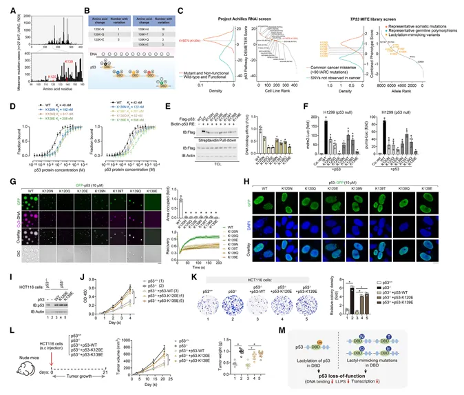 功能实验显示,K-to-E突变体与p53RE-DNA结合力丧失最严重,转录活性几乎完全消失,LLPS能力受损,在p53-/-细胞中无法抑制增殖、集落形成和异种移植瘤生长。此外,乳酸化与乙酰化在相同位点相互排斥:乳酸化p53不能被乙酰化,乙酰化p53也不能被乳酸化,而乙酰化与乳酸化功能相反。