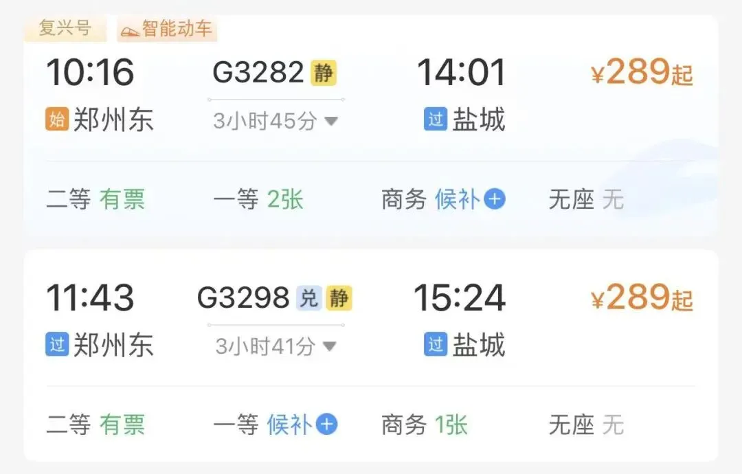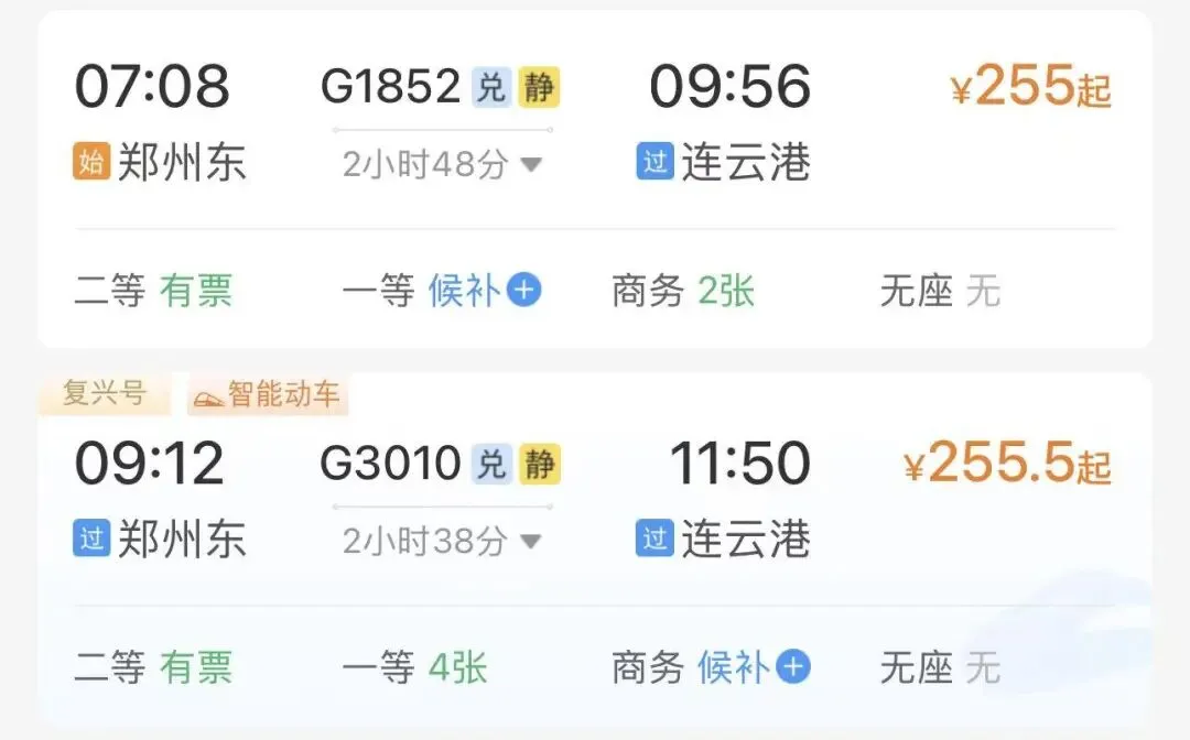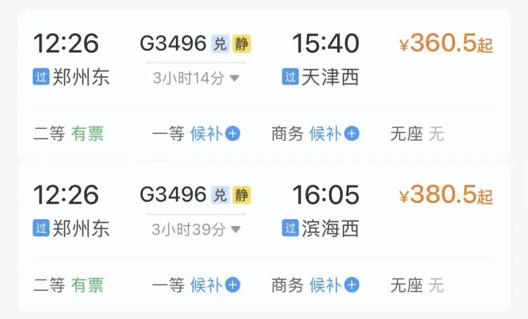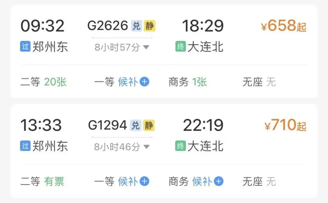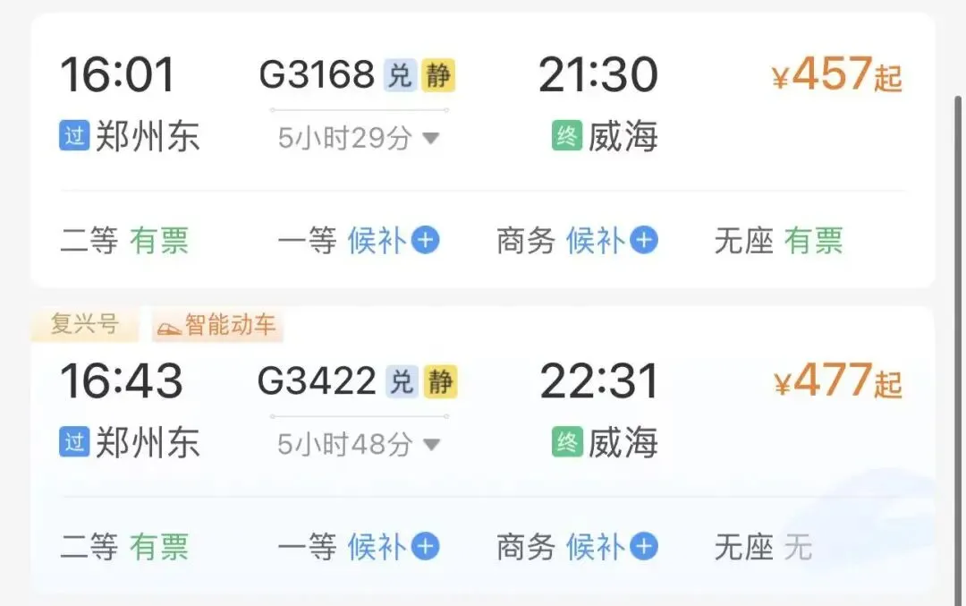 注意:以下票价数据来源于铁路12306APP截图