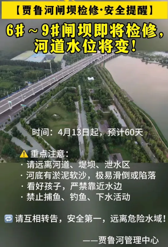 近期,郑州贾鲁河河道管理部门发布了一则重要通知:自2026年4月13日起,贾鲁河的闸坝将迎来检修,河道水位将发生变化。经常钓鱼的人都清楚,6-9号坝的大概位置在文化路到中州大道这一段,这里也是郑州钓友们经常垂钓的地方。其中文化路附近、中州大道以东的河段,钓鱼人数量众多,有时候甚至是一位难求。4月13日,就有钓友拍到贾鲁河文化路、中州大道附近的河水已经见底,这里原本是钓友们打卡的好地方,但现在已经不能下竿了,大家近期钓鱼的话切勿走空,可以到其他地方看看。据悉,此次检修将持续60天时间,也就是到6月中旬,河道的水位才能恢复。这段时间,正是钓大板鲫的好时候,河道见底对钓友们来说不是个好消息。但为了汛期防洪安全,大家也要理解一下。文化路到中州大道这一段不能钓鱼了,附近还有哪些钓点?我建议大家可以去索须河看看,上周末路过的时候还有不少钓友,而且都下鱼护了,说明鱼情还不错。还有就是中州大道东侧的污水处理厂排水口附近,水位可能不受影响,最近那里的大板鲫不少,周六我在那垂钓2小时,收获十几条鲫鱼。只不过这个位置有点走水,需要重铅到底,钓“跑铅”会好一点。各位钓友,你还知道郑州哪里有钓鱼的好地方,也可以分享出来。