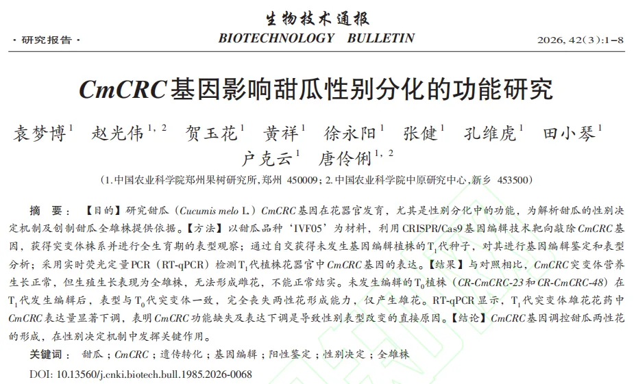 近日,中国农业科学院郑州果树研究所赵光伟团队在《生物技术通报》发表了题为《CmCRC基因影响甜瓜性别分化的功能研究》的文章。本研究利用CRISPR-Cas9技术构建CmCRC突变体,通过表型观察和分子分析,验证CmCRC对甜瓜花器官性别分化的调控作用,这既深化了对植物性别决定机制的认识,也为甜瓜杂交制种创制全雄株父本材料提供理论支撑。