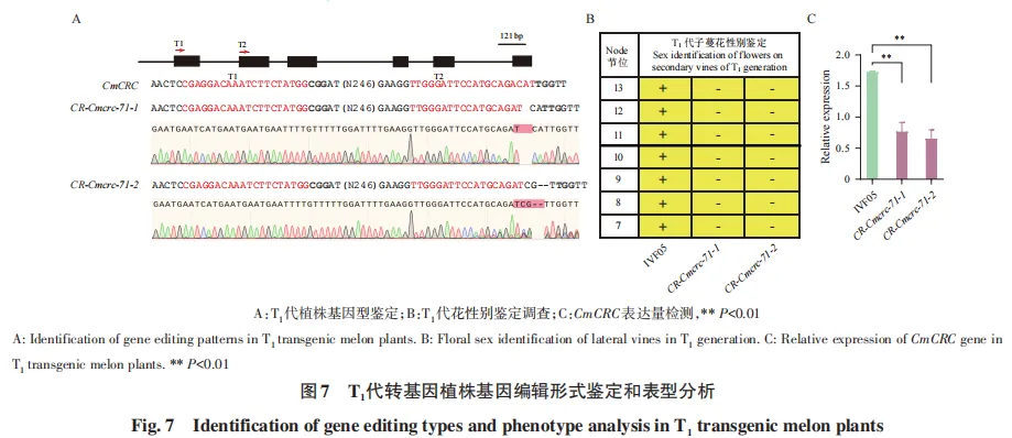 通过基因编辑甜瓜CmCRC基因获得突变体株系。突变体营养生长正常,但生殖生长呈全雄株表型,不形成两性花,无法结实。未发生编辑的T0代植株(CR-CmCRC-23和CR-CmCRC-48)在T1代出现编辑事件,完全丧失两性花形成能力,仅产生雄花。RT-qPCR结果显示,T1代突变体雄花中CmCRC表达量显著下调,其功能缺失及表达下调是导致甜瓜全雄花表型的主要原因。