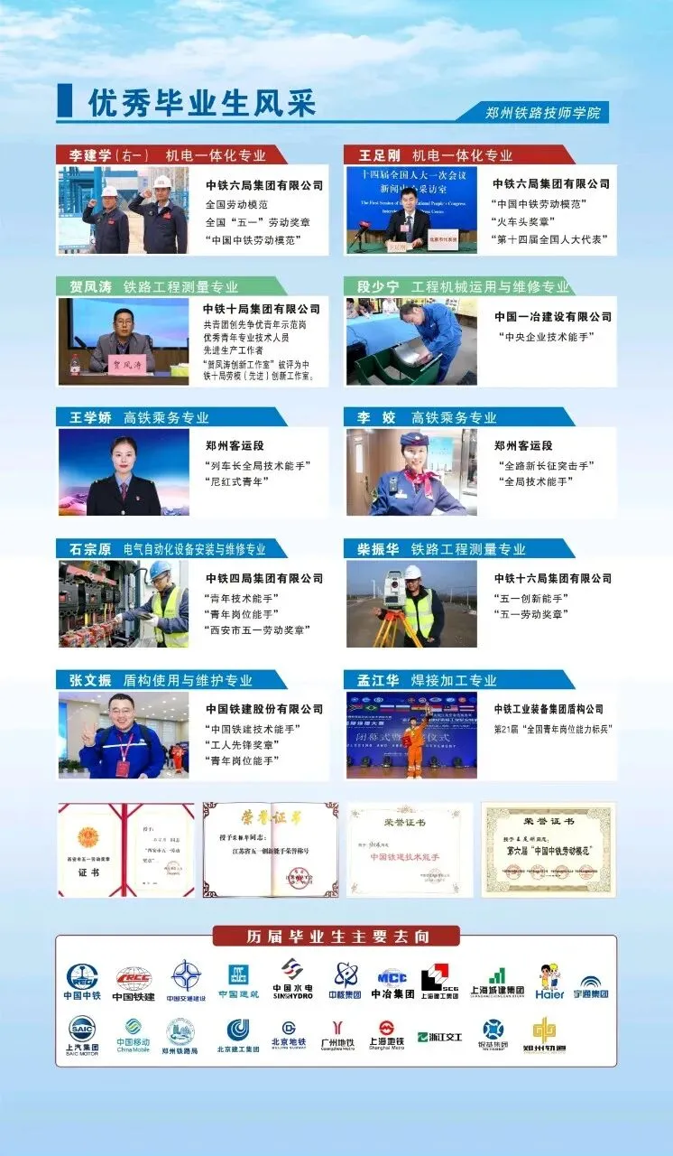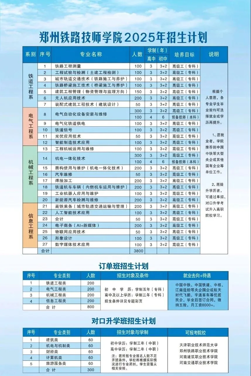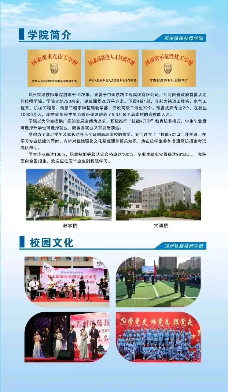 学院为了满足学生及家长对升入全日制高职院校的需要,专门设立了“技能+对口”升学班。在学习专业技能的同时,有针对性地强化文化基础课等相关知识,为在校学生参加普通高校招生考试提供帮助。学生毕业率达100%,职业技能等级认定合格率达100%,毕业生就业安置率达98%以上。郑州铁路技师学院招生简章(2026最新版)