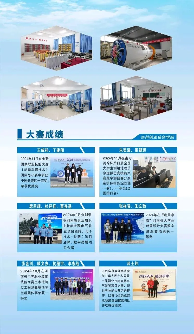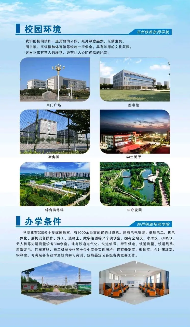 郑州铁路技师学院创建于1975年,隶属于中国铁路工程集团有限公司,系河南省政府首批认定的技师学院。学院位于郑州市上街区五云路68号,学院占地720余亩,建筑面积20万平方米。下设4系1部,分别为铁道工程系、电气工程系、机械工程系、信息工程系和基础教学部,开设高级工专业32个、预备技师专业2个,在校生10000余人,建校50年来主要为铁路建设培养了5.3万多名高素质的高技能人才。 郑州铁路技师学院建有220多个多媒体教室,有1000余台高配置的计算机。建有电气安装、低压电工、机电一体化、盾构设备操作、焊工、混凝土、数字绘图等61个实训室;拥有全站仪、水准仪、GNSS、无人机等先进测量设备300余套。建有铁道电气化、铁道信号、牵引供电、铁道测量、铁道线路起重装吊、汽车驾驶、施工机械操作等十余个室外实训场所;建有舞蹈室、形体室、会计演练室、钢琴室。可满足各专业学生校内实习实训、技能鉴定及各级各类竞赛工作。