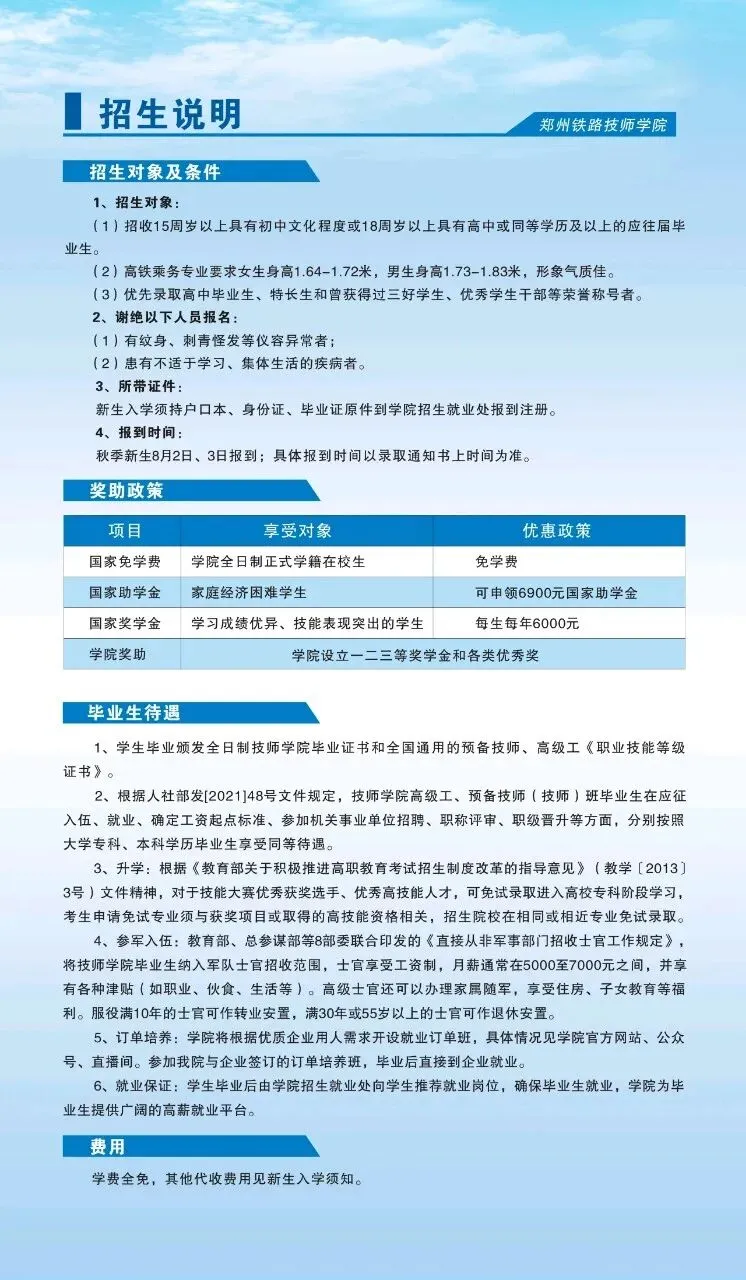 (1)招收15周岁以上具有初中文化程度应往届毕业生。(2)招收18岁左右具有中职或高中、应往届毕业生。(3)高铁乘务专业要求女生身高1.64-1.72米,男生身高1.73-1.83米,形象气质佳。(4)优先录取高中毕业生、特长生和曾获得过三好学生、优秀学生干部等荣誉称号者。▎谢绝以下人员报名:(1)有纹身、刺青怪发等仪容异常者;(2)患有不适于学习、集体生活的疾病者。