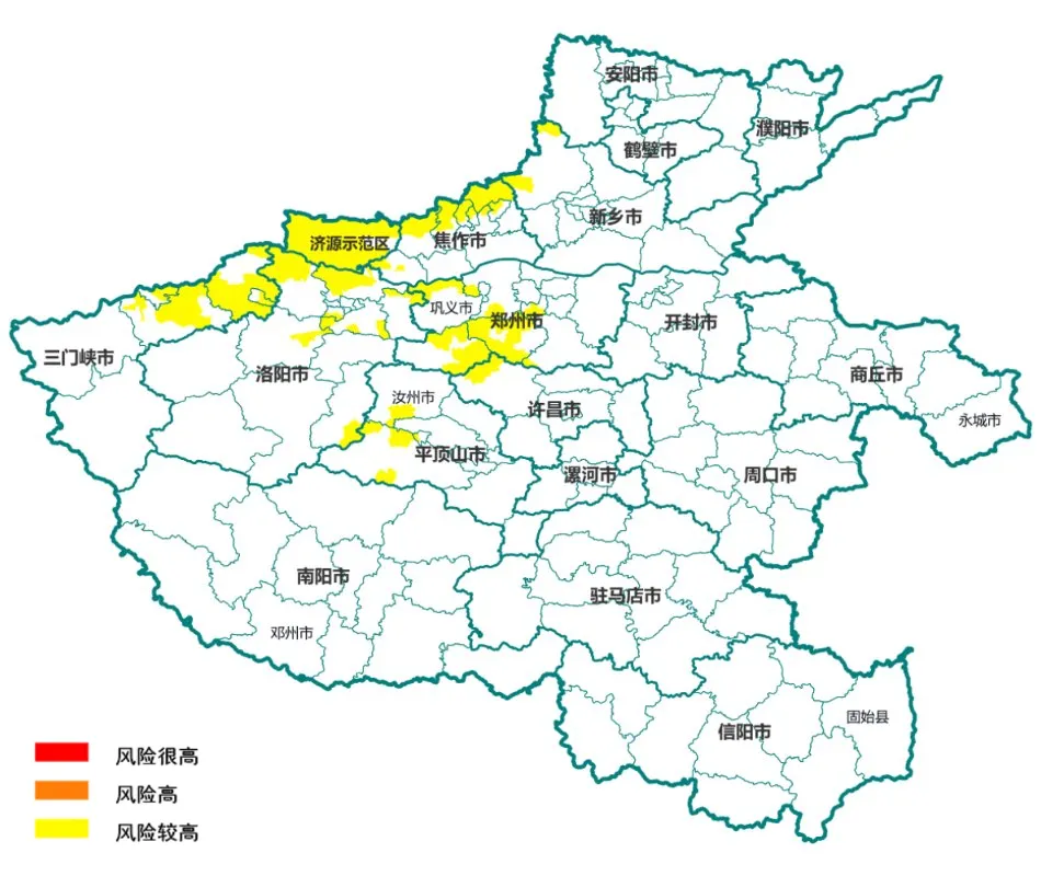 2025年9月5日8时至5日20时,河南省地质灾害气象风险预警达到黄色预警的区域为:济源大部,郑州南部及北部,三门峡东部,洛阳北部及东部局部,平顶山中西部及南部局部,新乡西部局部,焦作北部及西北部局部,许昌北部局部,发生地质灾害的风险较高。