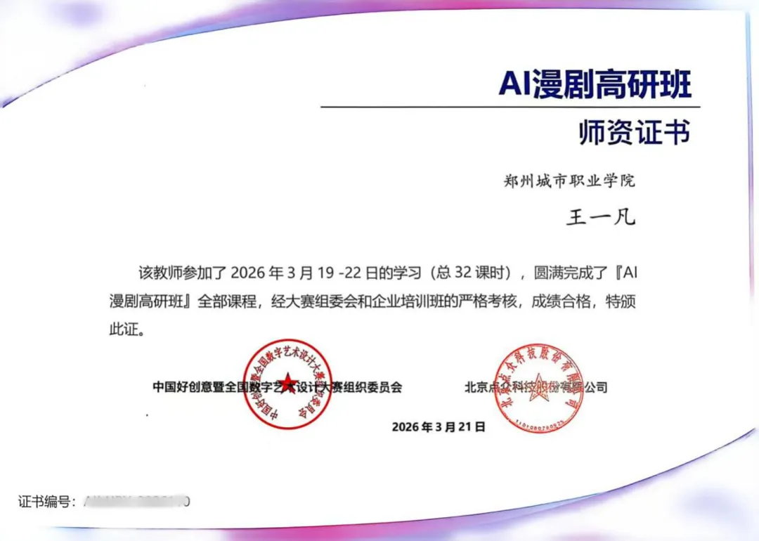 为了落实国家推动数字艺术与教育教学深度融合的相关要求,进一步提升郑州城市职业学院在人工智能与数字创意交叉领域的教学和科研水平,2026年3月19日至22日,郑州城市职业学院数字媒体系的骨干教师王一凡,前往西安邮电大学,参加了由中国好创意暨全国数字艺术设计大赛组织委员会与西安微短剧产业研究院联合举办的AI漫剧高级师资研修班。