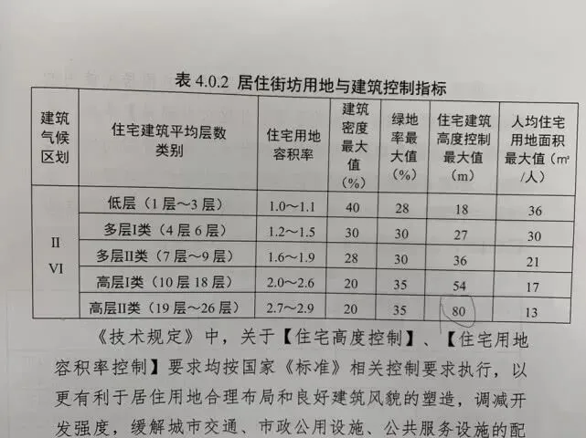 以高层Ⅱ类为例,住宅建筑平均层数为19~26层,住宅用地容积率2.7~2.9,不得超过2.9。建筑密度最大值20%,绿地率最小值35%,住宅建筑高度控制最大值80米。