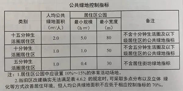 此外,按照《居住区标准》绿地更接近家门、方便居民使用的要求,《技术规定》中修改了【居住区公共绿地】条款,要求"为居住区配套建设、可供居民游憩或开展体育活动的公园绿地。新建各级生活圈居住区应配套规划建设公共绿地、并应集中设置具有一定规模,且能开展休闲、体育活动的居住区公园",公共绿地控制指标应符合下表要求。