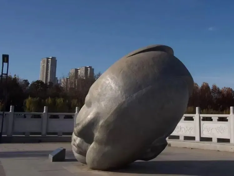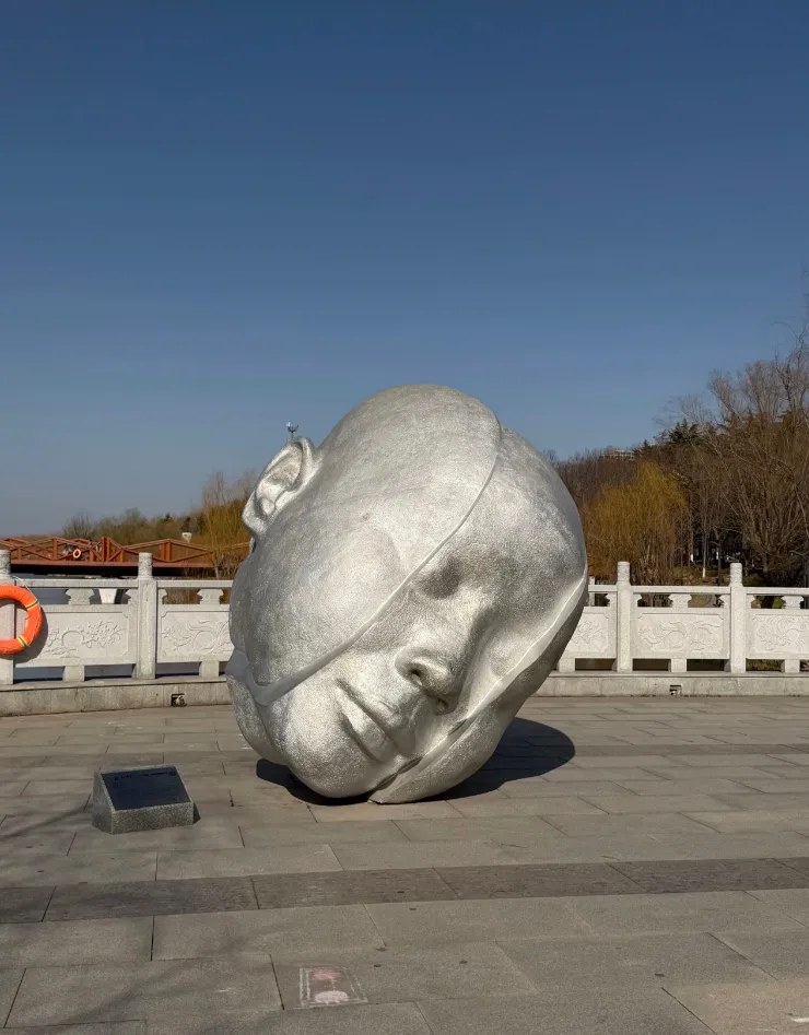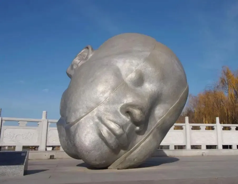 这件雕塑作品的名字叫《Dream》,是在郑州雕塑公园里面的,这个倾斜的、不锈钢锻造的闭合双眼的头像看着确实是有点瘆人,特别是有些角度上看,分割线比较明显,像是被劈成了三块一样。当您看到这样的雕塑您会觉得这个雕塑家是想表达什么吗?