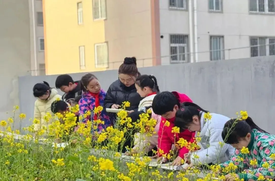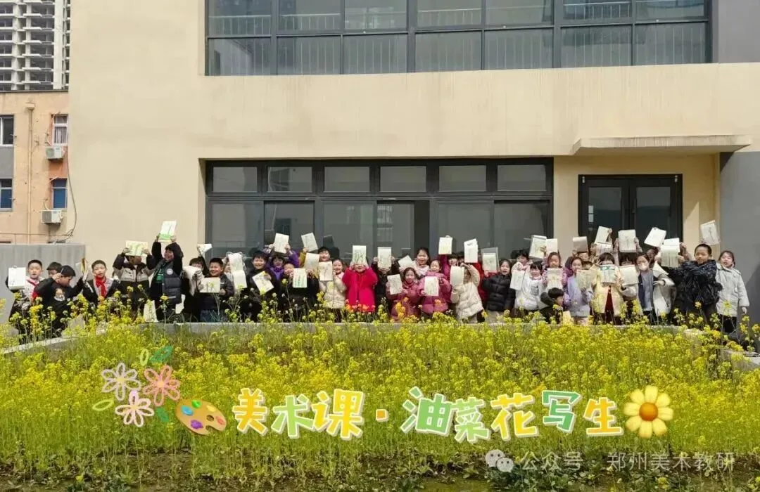 春意盎然的油菜花田前,二七区陇西南华府小学的老师带着孩子们,正手持画笔与画纸,静立于金浪翻涌的田野之间。