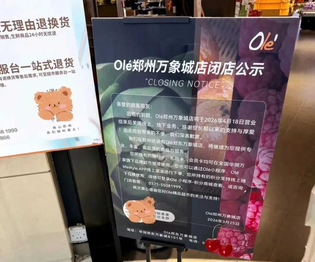 据郑州商业观察表示,Olé郑州万象城店的闭店,核心原因是门店租约到期,华润万家与万象城方面未达成续约协议。