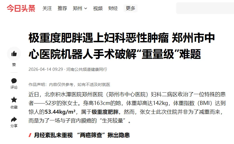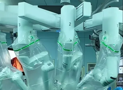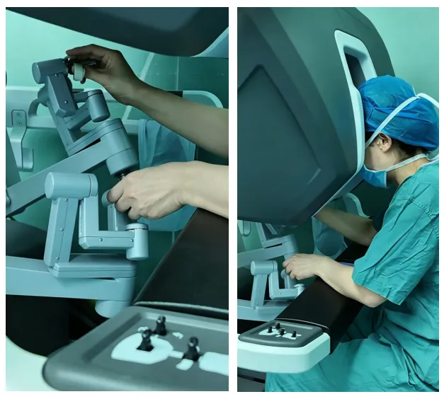 面对张女士BMI高达53.44kg/m²的极重度肥胖状态,传统手术方式面临腹壁肥厚、腹腔空间狭窄、头低脚高体位下心肺功能负担加重等重重挑战。栗浩然主任团队迅速组织全科讨论,为张女士量身定制了最优治疗方案——机器人辅助腹腔镜手术。