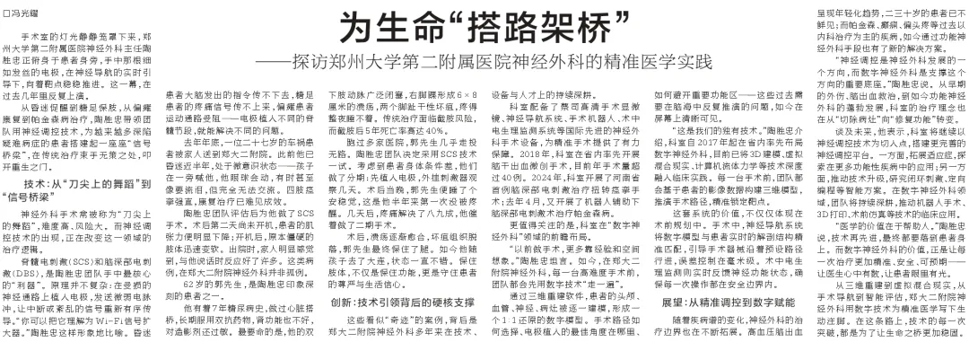 脊髓电刺激(SCS)和脑深部电刺激(DBS),是陶胜忠团队手中最核心的“利器”。原理并不复杂:在受损的神经通路上植入电极,发送微弱电脉冲,让中断或紊乱的信号重新有序传导。“你可以把它理解为Wi-Fi信号扩大器。”陶胜忠这样形象地比喻。昏迷患者大脑发出的指令传不下去,糖足患者的疼痛信号传不上来,偏瘫患者运动通路受阻——电极植入不同的脊髓节段,就能解决不同的问题。
